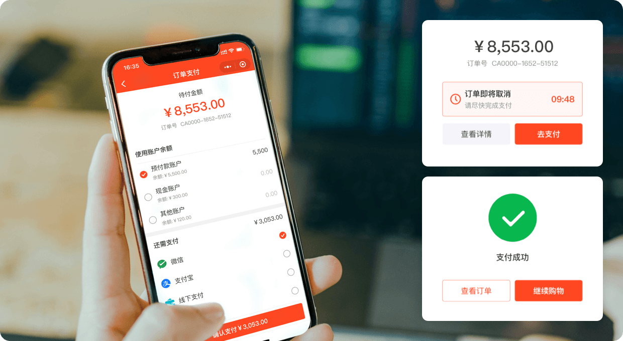 您可让下游客户在商城下单后马上付款,在线支付不仅免对账,还可减少赊账坏账。易订货2.0提供多种低费率、可对私的支付通道帮您节省支付费率和税费,配套还有欠款不允许下单、付款倒计时、多账户切换收款等功能帮您减少赊账坏账